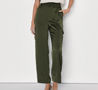 Add slinky texture and a pop of color to your look with these olive satin trousers.