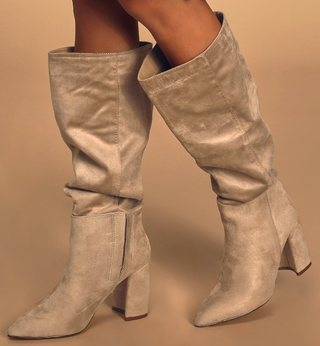 The Lulus Katari Boots showcase a sophisticated pointed-toe upper crafted from taupe vegan suede.