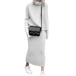 It looks fancy because of the skirt, but this sweater set is so cozy and stretchy that you'll be comfortable wearing it all day.