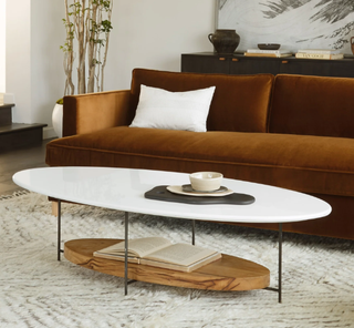 Add this sleek oval-shaped coffee table to your living room. The reclaimed French oak shelf below makes the perfect spot for books, decor pieces and more.