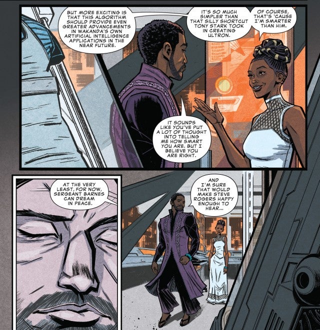 As for the connective tissue of how Bucky got here, with his mind right and a man bun, it may be alluded to in the movie -- when Shuri receives "another broken white boy to fix" -- but the answer comes by way of an Infinity War prequel comic, in which Shuri undoes Bucky's HYDRA brainwashing using a... special algorithm. (It's complicated.) What's important is that Bucky is officially a good guy again, just in time for the ultimate big bad to arrive.