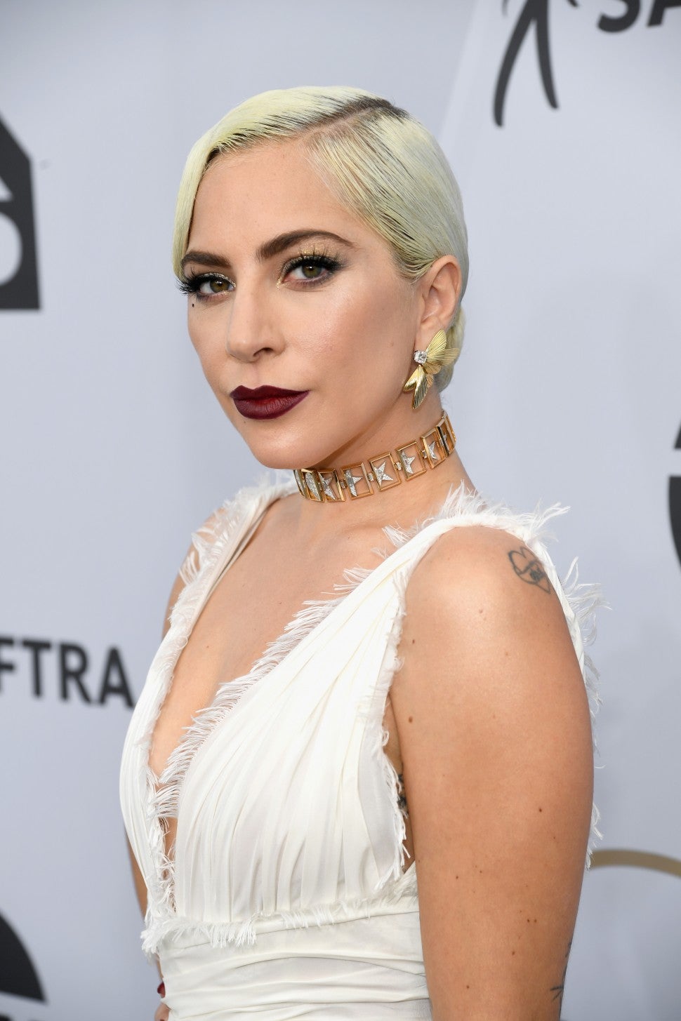 Gaga paired her angelic white Dior Haute Couture dress with an edgy dark lip. The pop star's makeup artist, Sarah Tanno, mixed Marc Jacobs Beauty Le Marc lipsticks in Blow and Dashing, lined with Poutliner in Currant Mood.
