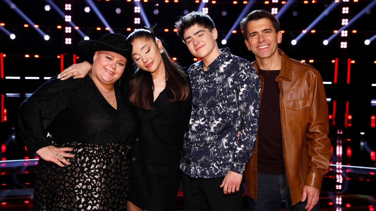 Team Ariana Grande's remaining competitors from the Top 11 -- Kentucky singer Holly Forbes and Connecticut-based father-son duo Jim and Sasha Allen -- took the stage with their coach on a cozy campfire set for a pitch-perfect performance of the Kanye West, Paul McCartney, and Rihanna collab "FourFiveSeconds."