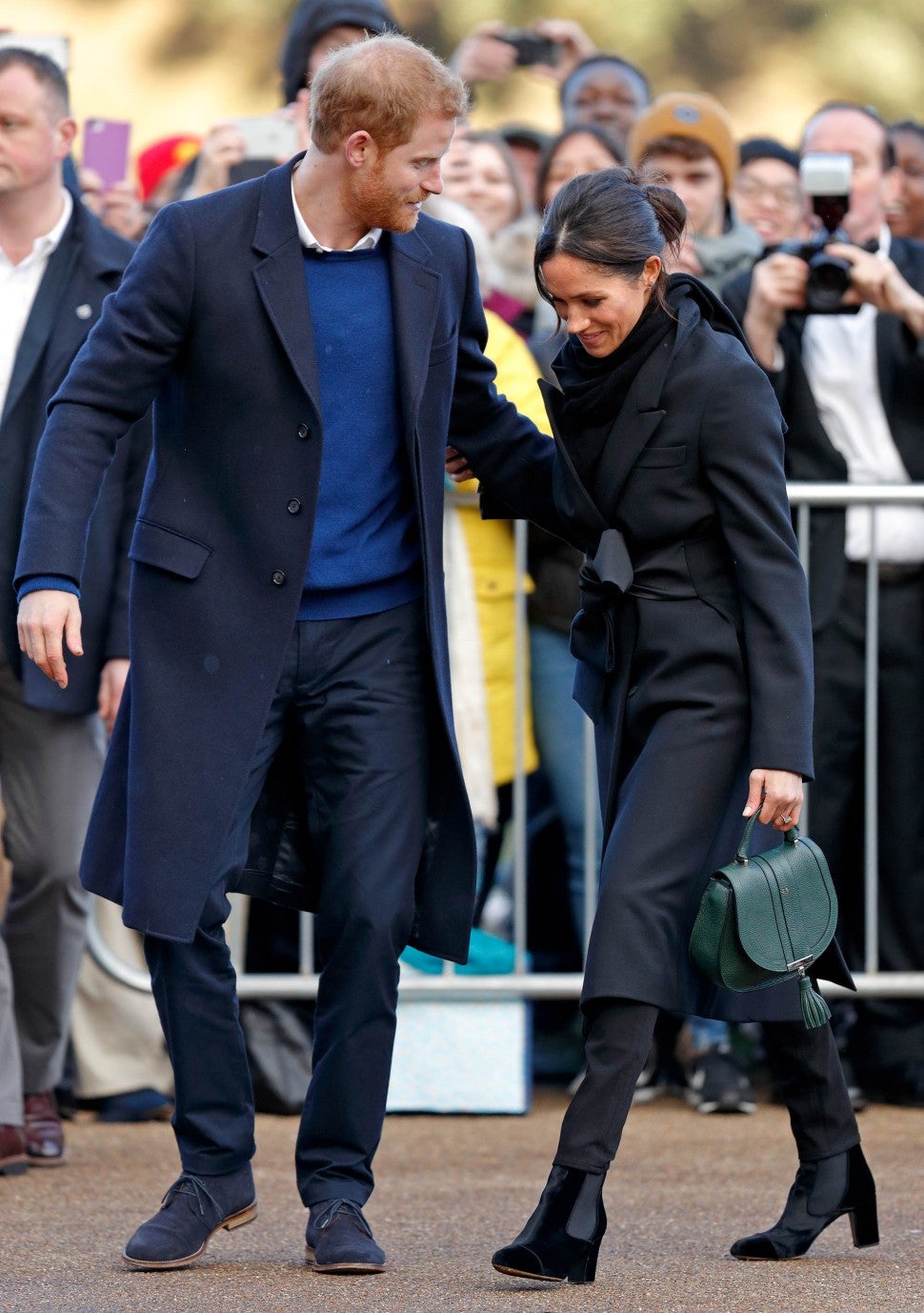 Allow the Duchess of Sussex to show you how to elevate the ankle boot. Markle teamed her pair with a cozy belted coat, scarf and skinny jeans, finished off with a sleek bag.