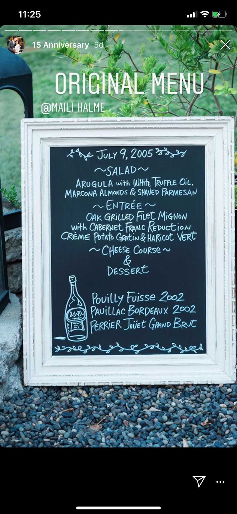 "Last night I surprised my husband with a special 15 year anniversary gift," she wrote. "I recreated [an] 'at home' version of our wedding. From the table, to the flowers, to the decor and even the menu beautifully re-created by my dear friend @maili_halme who did our wedding."