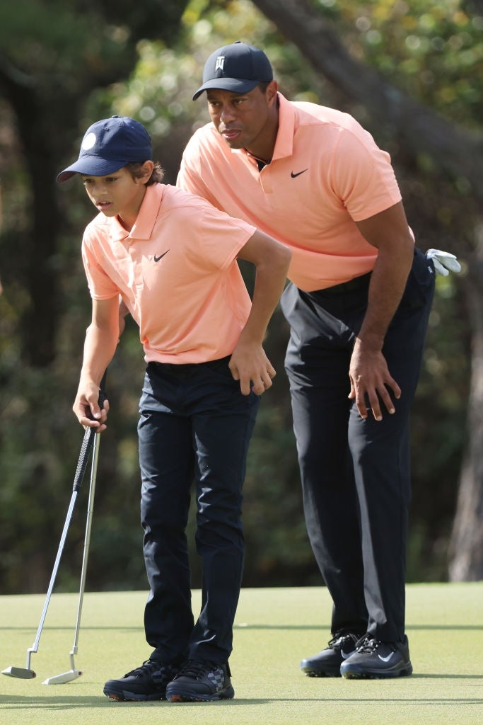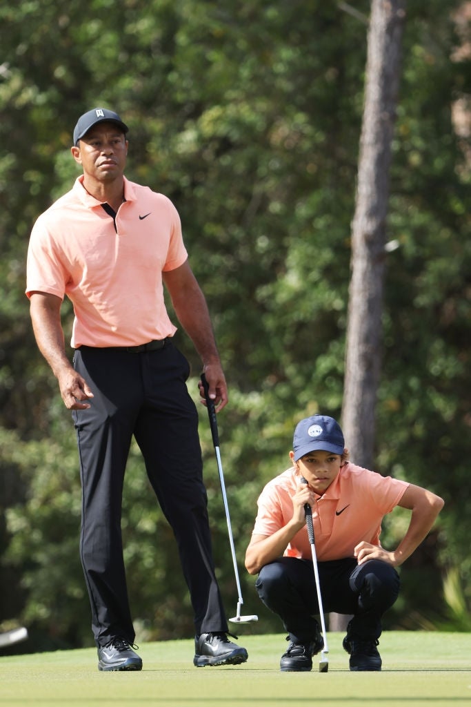 The 45-year-old star returned to competitive golf for the first time in nearly a year on Saturday at the PNC Championship in Orlando. Woods' 12-year-old son, Charlie, was there by his side wearing matching outfits, which included a peach-colored polo shirt.