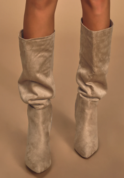 The Lulus Katari Boots showcase a sophisticated pointed-toe upper crafted from taupe vegan suede.