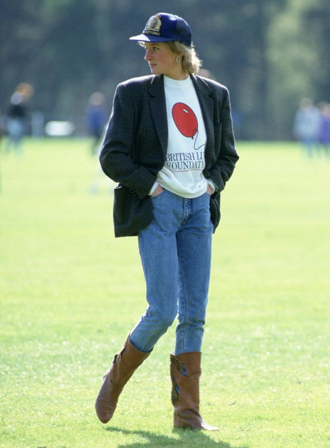 A pair of high-wast jeans was a staple for Diana in the late '80s. She looked effortless and cool for an event at the Guards Polo Club in a graphic sweatshirt under an oversized blazer, styled with denim, slouchy boots and a trucker hat.