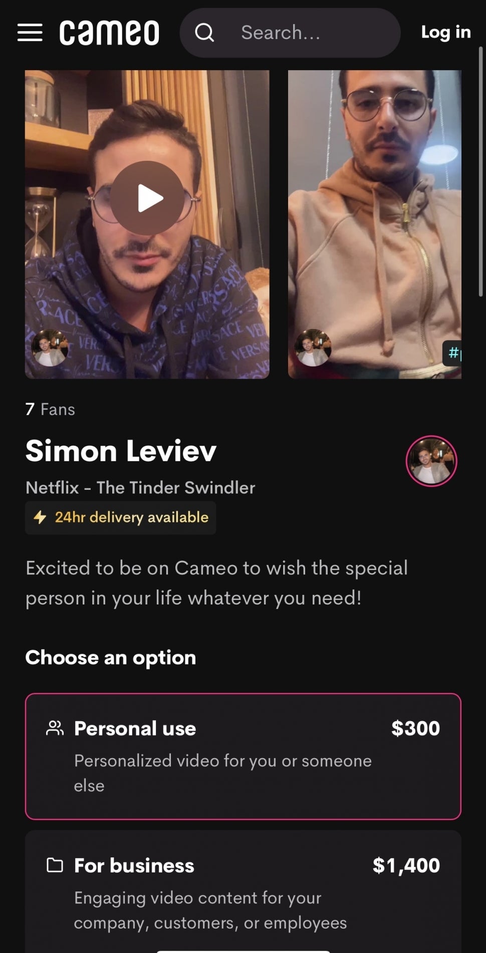 Just this week, Leviev joined Cameo, a place fans can request personalized videos from thousands of stars, and apparently alleged con artists, for a price. Leviev is charging $300 for personalized video messages and $1,400 for business ones.