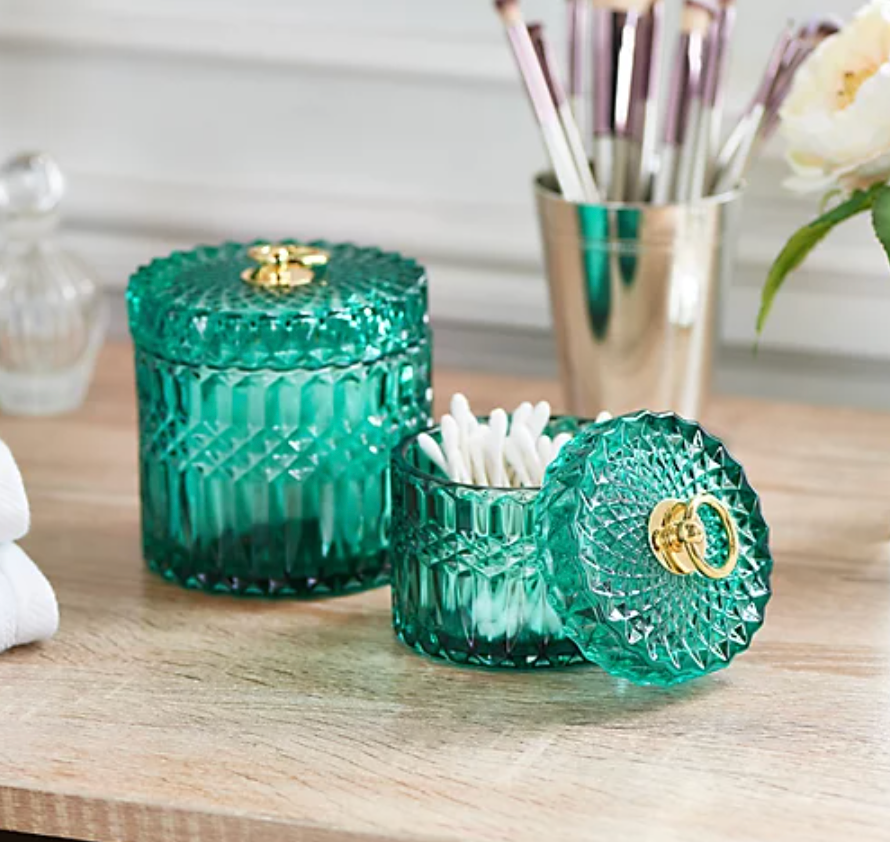 These etched glass jars would look gorgeous in any bathroom for storing q-tips, cotton pads and more.