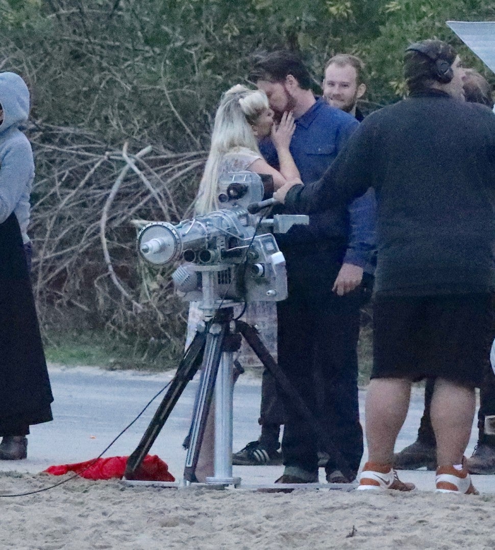 On Tuesday, the couple was spotted kissing on a set in Malibu, California, and appeared to be filming a scene as they were surrounded by a camera crew. Spelling was wearing a belted printed dress that was paired with pearls, red lipstick and a sunflower that was placed in her '50s-styled hair. As for McDermott, he sported a dark blue dress shirt that was tucked into black slacks.