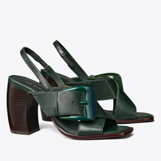 For in-between seasons, the Banana Heel Sandal is designed with an oversized buckle and crossover straps in soft, tumbled leather that has a subtle shine.