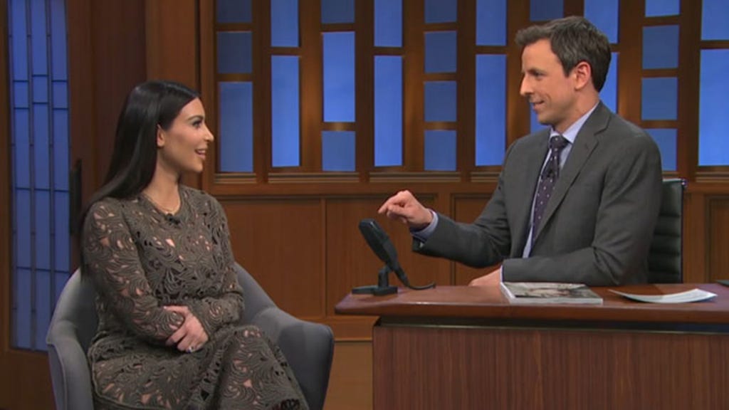 Kim Kardashian drops some wedding hints on Late Night with Seth Meyers, and reveals some Vogue magazine set secrets.