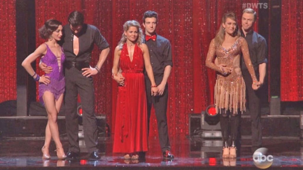 Candace and Mark Ballas were up next, dancing an energetic quickstep/samba fusion that elicited cheers from the audience and wild enthusiasm from the judges. However, their scores didn't quite live up to the perfection of Amy and Derek, as Bruno, Len and Carrie Ann awarded 9s across the board for a total score of 27.
