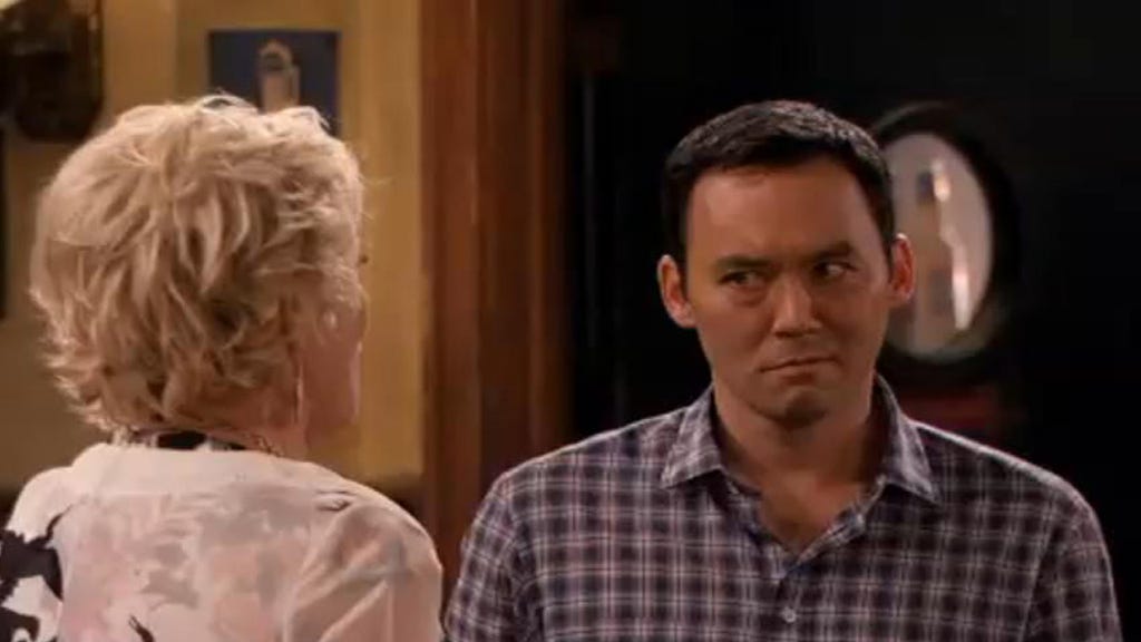 "Your sexual aura is much different than last night, you are white-hot, Mister," Carol exclaims in the clip. Steve denies that he has a girl in his life, but that doesn't deter the bar regulars and his family from commenting on his love life.