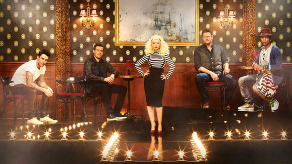 Fresh off of his season 7 debut, music producer extraordinaire Pharrell Williams decided to stick around for another chance to coach America's undiscovered singers into stars. Joining the "Happy" singer, are Voice mega-veterans Blake Shelton and Adam Levine -- aka realty TV's best and most tumultuous bromance. Rounding out the group, The Voice's original blonde beauty, Christina Aguilera, who is glowing after giving birth to her second child last summer.