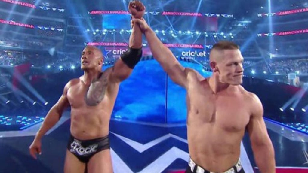 Still outnumbered, another surprise return came to Rock's rescue: John Cena, who has been sidelined by injuries. The two sent the bad guys running and posed triumphantly for the fans.