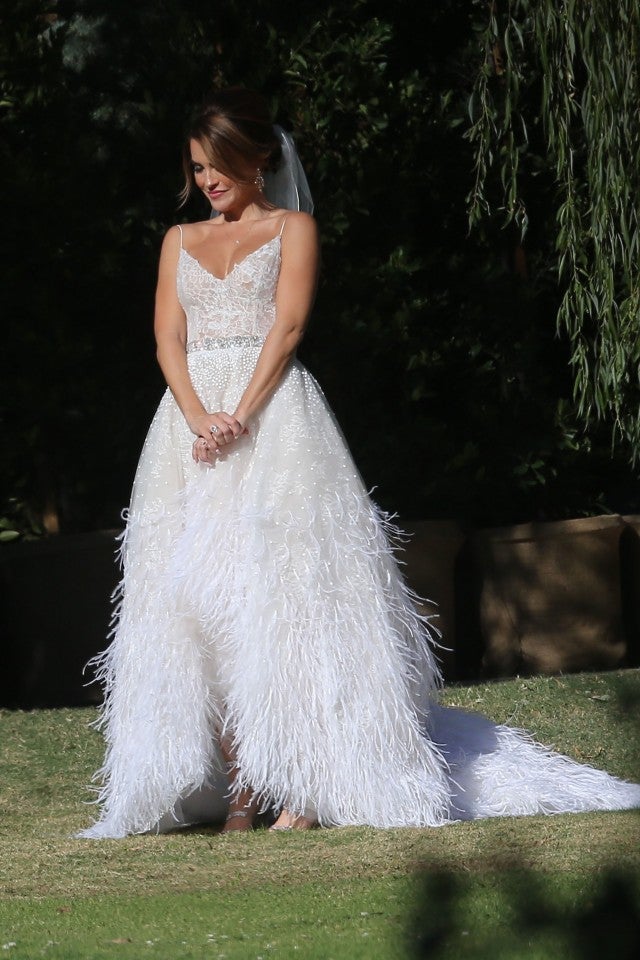 Stause stunned in an intricate Monique Lhuillier gown adorned with feathers and beads.
