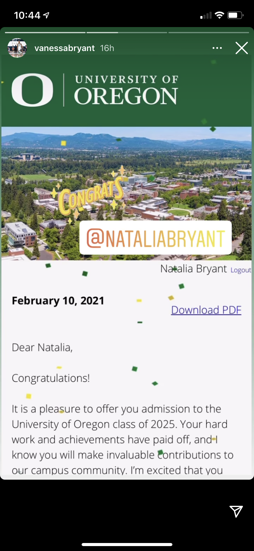 Vanessa shared the exciting news on her Instagram Story on Wednesday, alongside a screenshot of Natalia's acceptance letter offering her a spot in University of Oregon's class of 2025. "Congrats @NataliaBryant," the proud mom wrote.