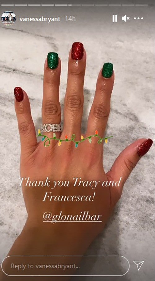 In another Instagram Story, Vanessa showed off her sparkly red and green holiday manicure, which also gave her followers a glimpse at her diamond ring, which spells out "Kobe" in jewels.