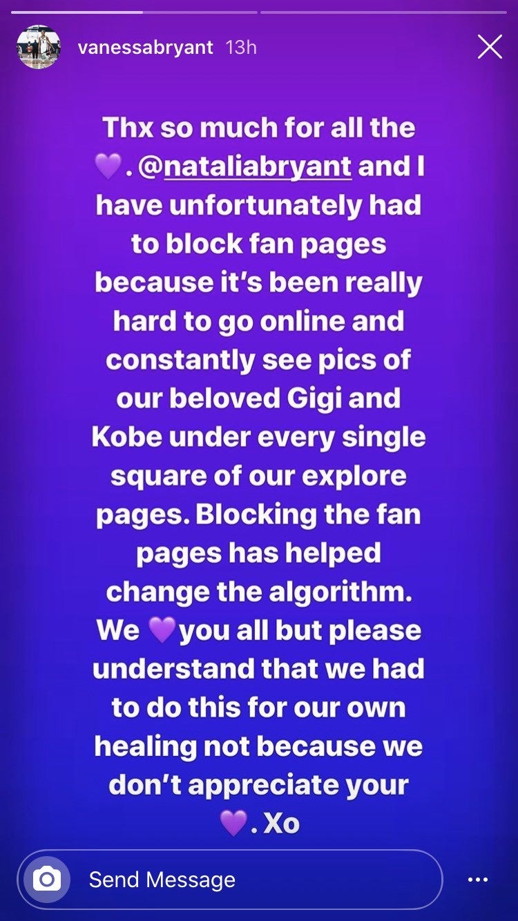 "Thx so much of all the ?," Vanessa began. "@nataliabryant and I have unfortunately had to block fan pages because it's been really hard to go online and constantly see pics of our beloved Gigi and Kobe under every single square of our explore pages. Blocking the fan pages has helped change the algorithm."