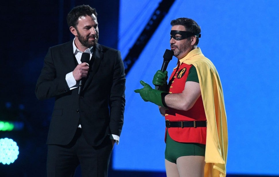 Taking the stage right after Lopez's second performance of the night, Ben Affleck and Jimmy Kimmel entertained the crowd in between sets. Kimmel thought it would be funny to wear a Robin costume onstage, but was a bit upset that Affleck, who previously portrayed Bruce Wayne, didn't suit up as Batman for the event (he opted for a classic look instead).