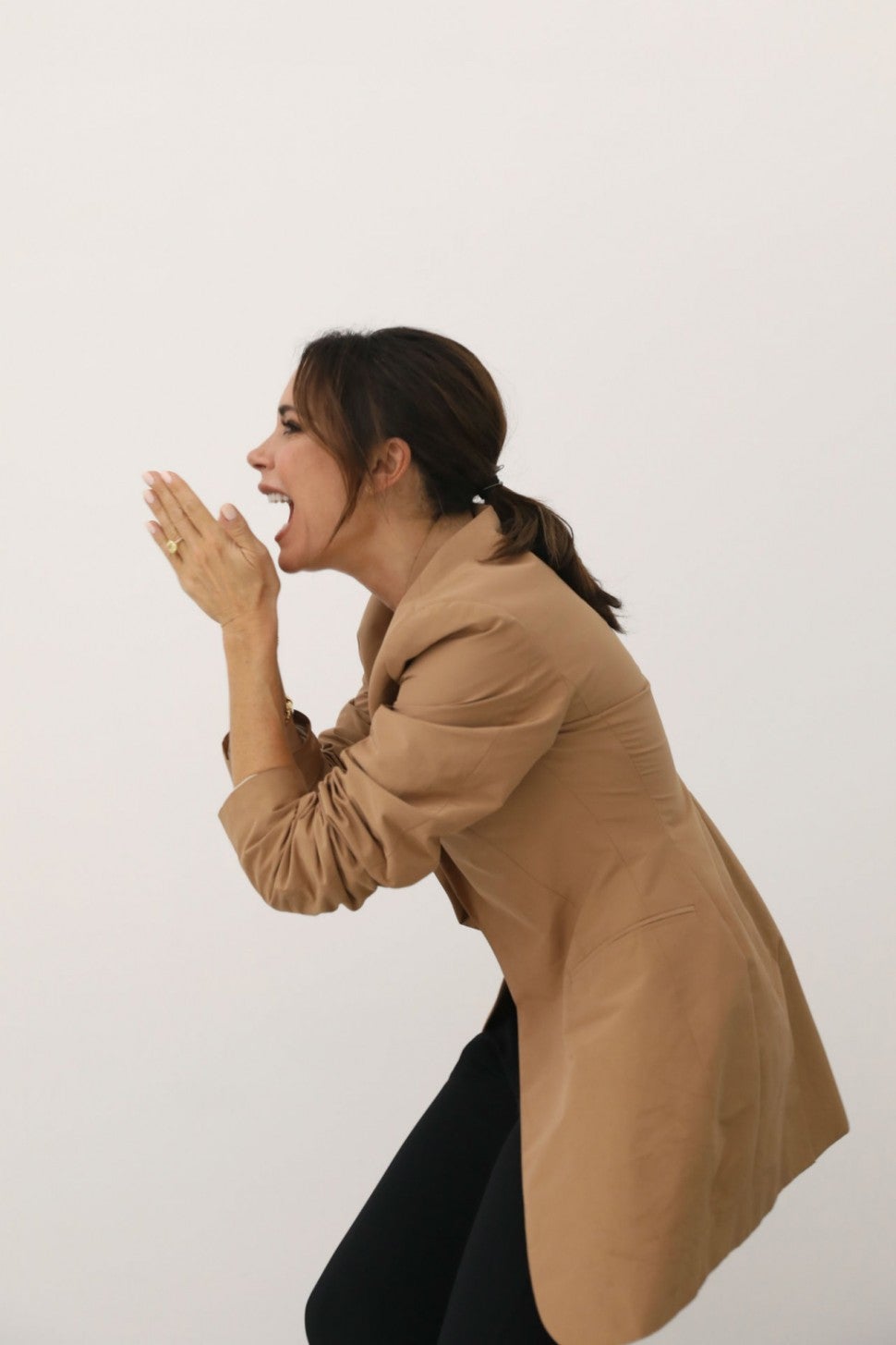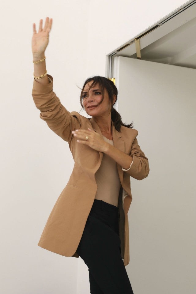 Beckham, 44, sported a camel coat and black pants on the runway, letting her hair fly out of her ponytail with the rush of emotion.