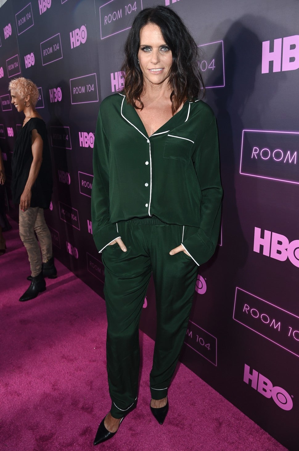 Amy Landecker tucked an olive green top with white piping into a matching pair of pants at the Room 104 premiere in Los Angeles in July.