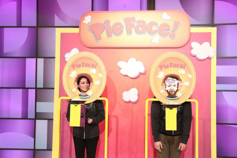 "It's really jigglin' in there," he notes, just before getting slapped with a cream pie.