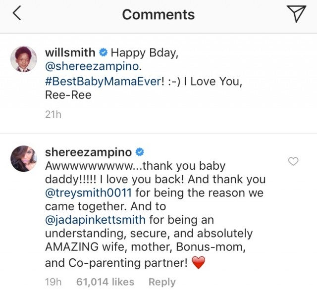 "Awwwwwwwww…thank you baby daddy!!!!! I love you back! And thank you @treysmith0011 for beng the reason we came together. And to @jadapinkettsmith for being an understanding, secure, and absolutely AMAZING wife, mother, Bonus-mom, and co-parenting partner!"