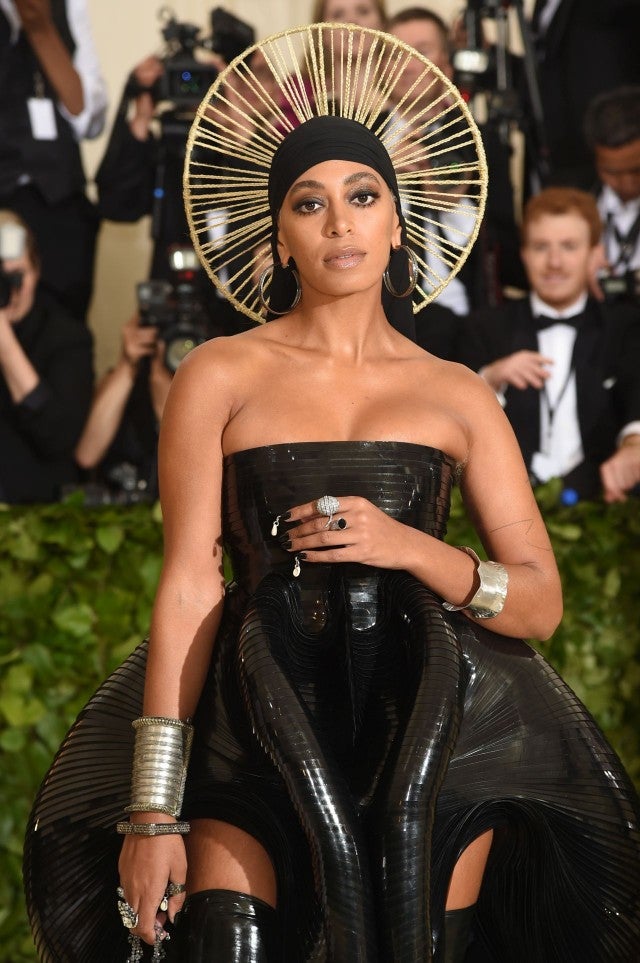 Meanwhile, Solange Knowles went with a contemporary interpretation of the Black Madonna with a gorgeous braided halo and durag. She completed the look with a black Iris van Herpen dress and Lorraine Schwartz jewelry.