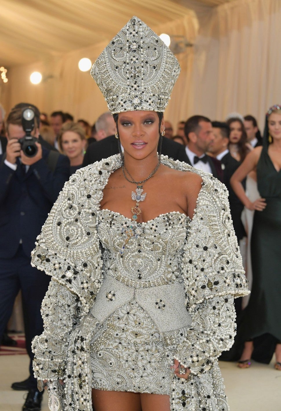 Rihanna proved once and for all why she's the queen of fashion's biggest night in an outfit that perfectly encapsulated the night's "Heavenly Bodies: Fashion and the Catholic Imagination" theme. She topped off her appropriate Margiela Artisanal gown by John Galliano with a matching headpiece reminiscent of a pope's mitre, an elaborately decorated hat.