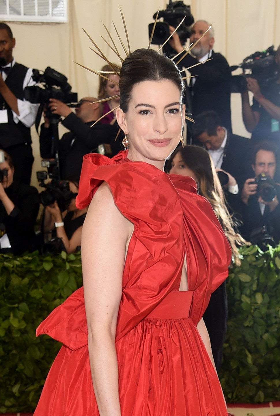 Opting for a much brighter ensemble, Anne Hathaway paired her vibrant red Valentino gown with a sharp gold headpiece and matching James Banks earrings.