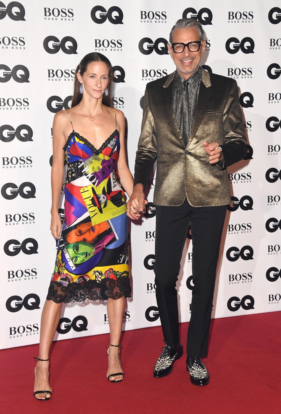 Jeff Goldblum dared to be bold in a gray metallic shirt, which he paired with a gold shimmering blazer, black slacks and zebra print shoes. His wife, Emilie Livingston, also stood out from the crowd in a colorful Versace slip dress.