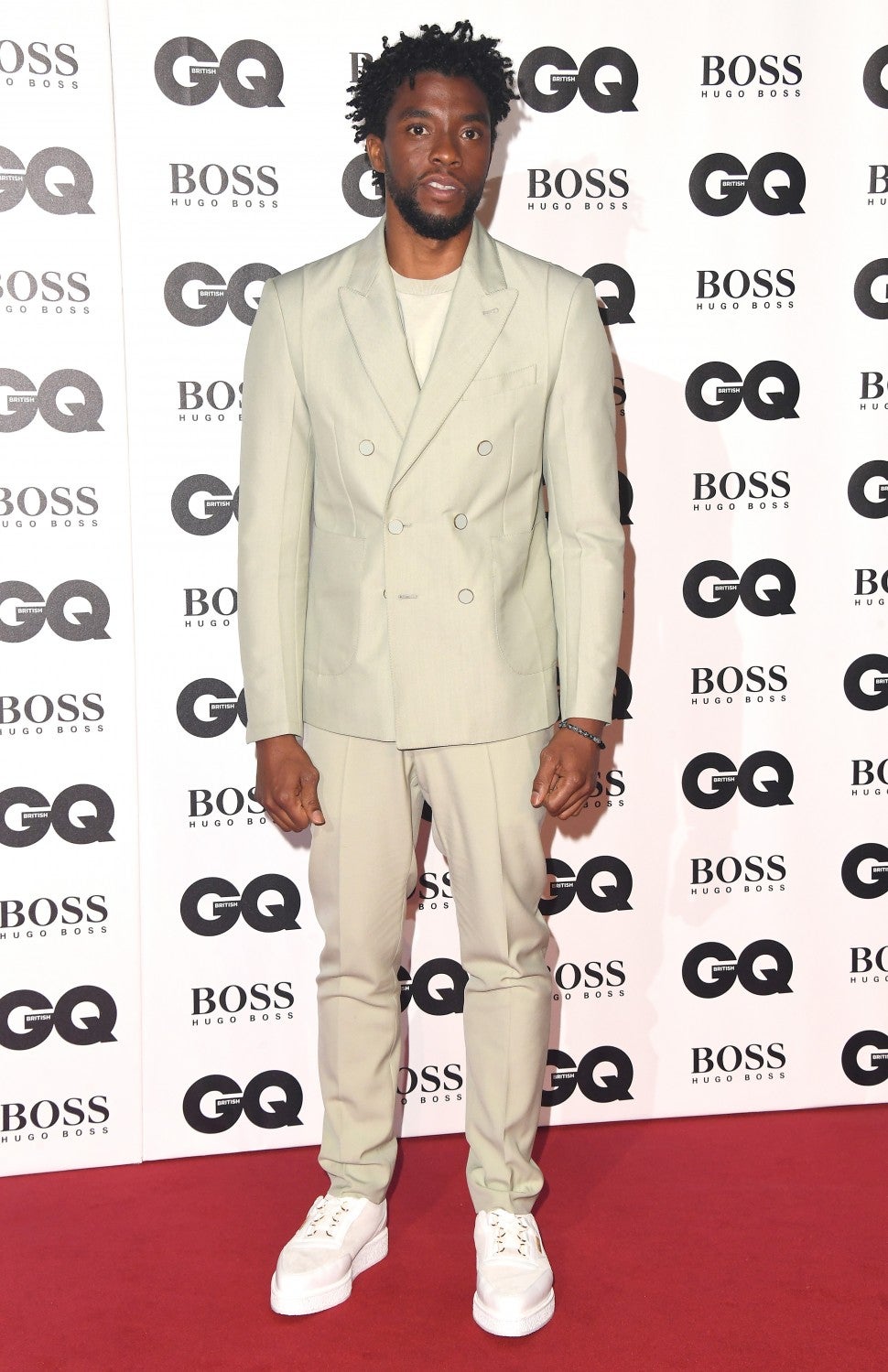 Chadwick Boseman stood out in a cream-colored Louis Vuitton double-breasted blazer and matching trousers.