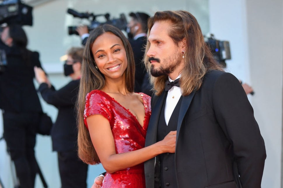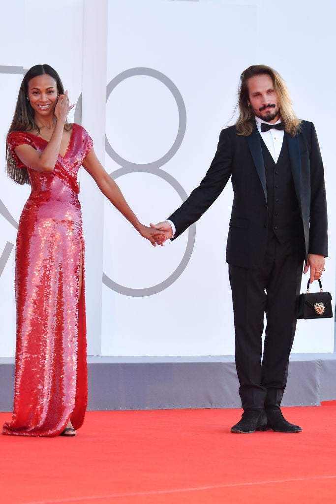 Zoe Saldana and her husband, Marco Perego Saldana, looked more in love than ever at the premiere of her new film, Hand of God, at the Venice International Film Festival in Venice, Italy Thursday. The 43-year-old actress sparkled in a red Dolce & Gabbana floor-length sequined dress, that featured a side slit, that showed off a bit of leg and her black, strappy sandals.